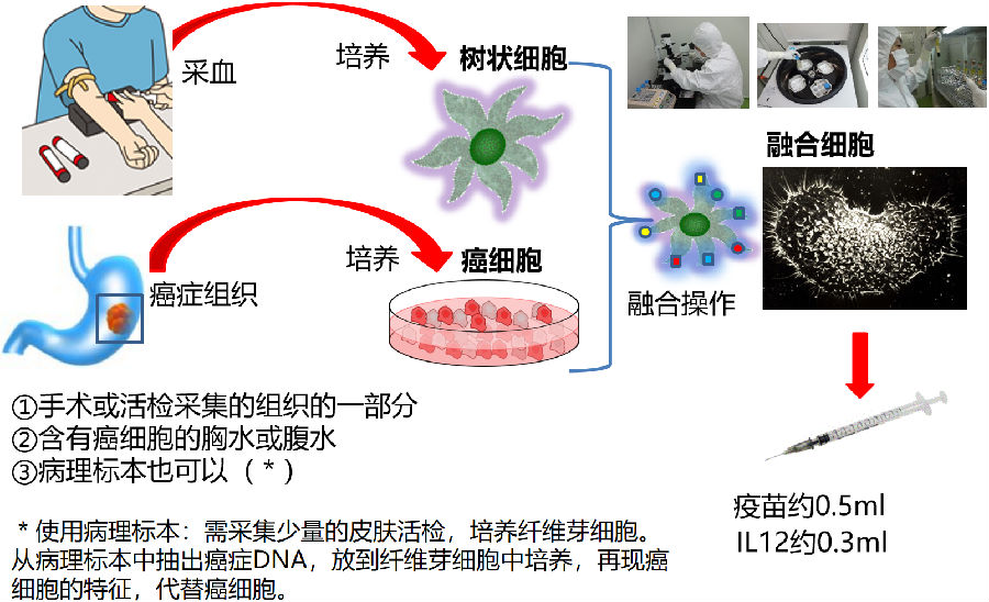 运用病患自己的肿瘤组织检体与自己的树突状细胞做融合反应,制造个人订制化树突状细胞肿瘤细胞(DC/TC)融合疫苗,此融合疫苗能提示种类繁多的肿瘤抗原,大幅增加患者免疫系统辨识并歼灭肿瘤细胞的能力。
